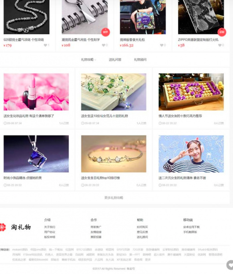admin 商业源码 2019-10-04 帝国CMS7.5仿可可礼物网漂亮大气淘宝客网站源码 带手机版+火车头采集 源码介绍: 帝国CMS 7.5 utf-8 PHP+MYSQL 淘宝客创意礼物在线导购网站源码 ,大型礼物类整站程序系统模板。 本源码模板清爽简单,同时可改成化妆品,女装,箱包类的淘宝客导购网,可以在文章攻略中插商品购买链接。 帝国CMS